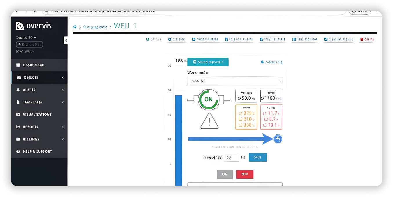 Vizualizați funcționarea pompei în timp real online. Monitorizați continuu frecvența, curentul, tensiunea și puterea pompei.